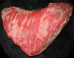 So, here's a picture of what it looks like raw. You can see the entire bottom of the cut is fat. If you don't have a triangle piece of meat about 3-5 pounds in weight and with the large slab of fat on the bottom, you don't have a tri-tip. Please go back to the store and ask for a California-cut tri-tip. (I don't know if other places cut it the same, but Minnesota DOES NOT).